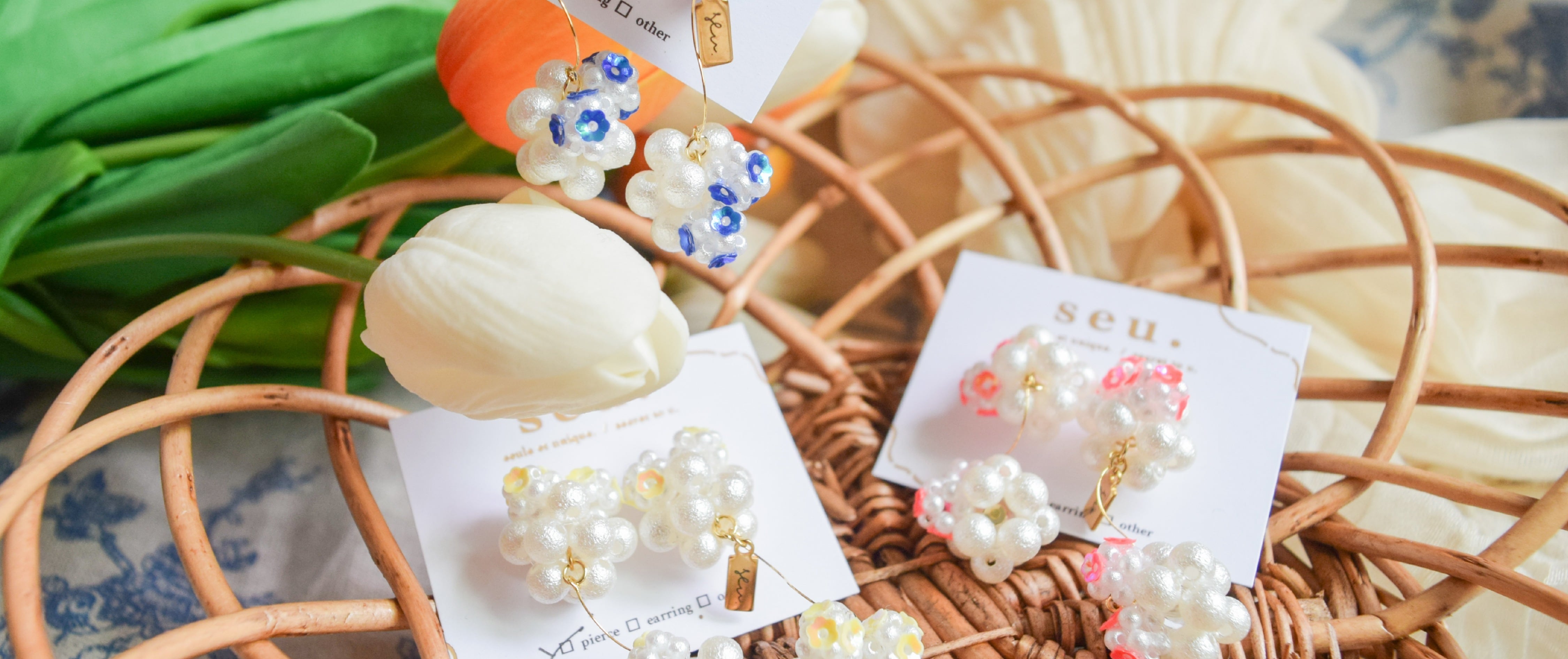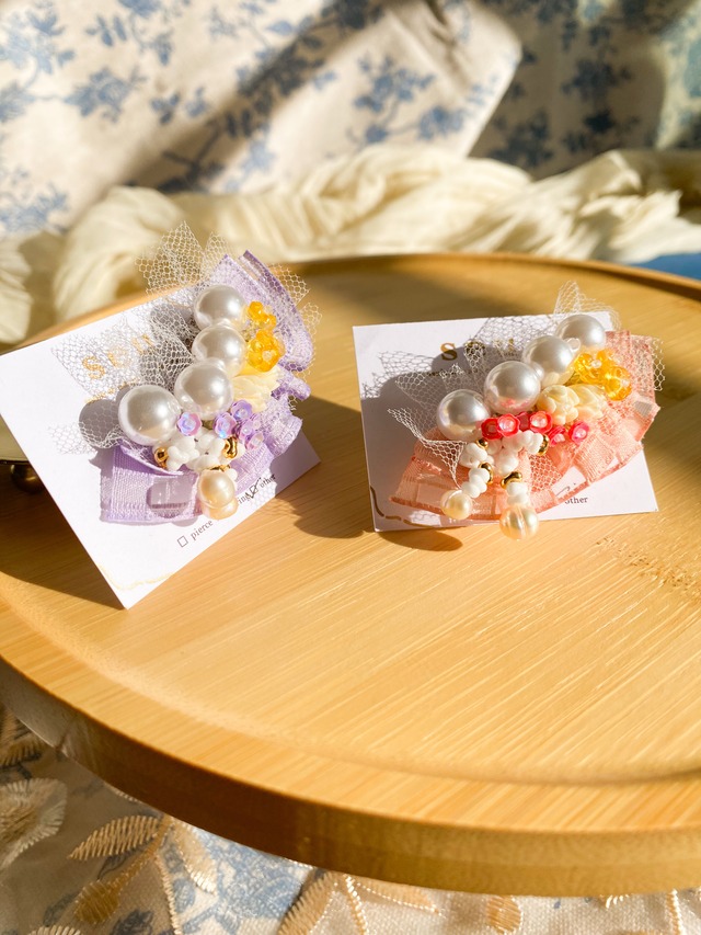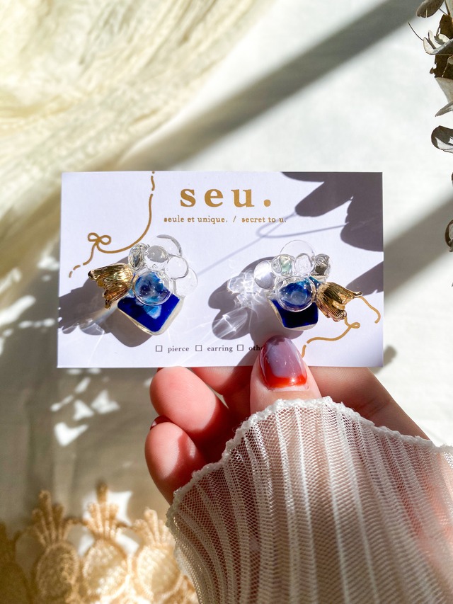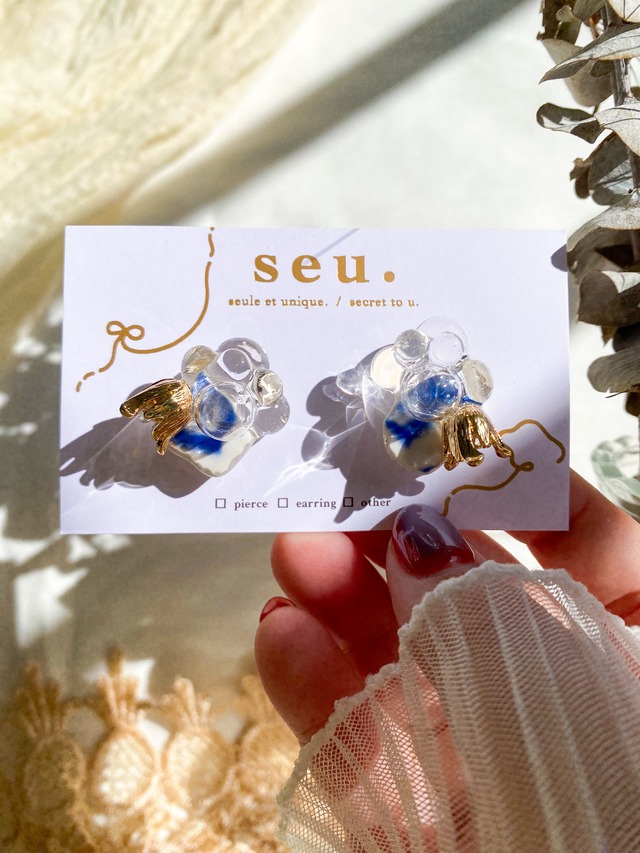 はねる、軽やか . オリジナルのアクリルパーツとビーズが織りなす華やかなアクセサリーです。 コットンパールやバブルビーズ、ちゅるんと煌めくドロップビーズを組み合わせ、seu.には珍しいじゃらじゃらとした華やかなアクセサリーです。 羽のようなお花のようなアクリルパーツは透明感たっぷりでまるでビーズたちが宙に浮いているようなそんなデザインです。 material▶︎コットンパール、アクリルパーツ、アクリルビーズ ーーーーーーーーーーーーーーーーーーーーーーーーーーーーー size list 縦 :約5cm 横 :約3cm 重さ:約14g(両耳) 金具:サージカルステンレス ※在庫作品になりますので、原則金具交換は受け付けておりません。 同じ作品を受注制作も可能ですのでご希望のお客様は、メッセージやメールにてご連絡いただけると幸いです。 ーーーーーーーーーーーーーーーーーーーーーーーーーーーーー カラー等、いつでもメッセージにご相談くださいませ:)
