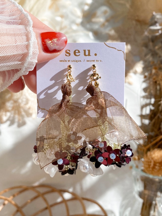 かわいいが 少し恥ずかしい あなたの恋へ。 . バレンタインってどうしても女の子らしいラブリーな色や形で溢れてる。 ラブリーが少し恥ずかしい、そんなあなたへさりげないバレンタインを。 love letterはアガパンサスというお花をモチーフにしたアクセサリーです。 アガパンサスの花言葉は『ラブレター』。 ひと目見ただけではわからない。だけどきっと身につけたら勇気をくれる。 あなたの恋の告白を応援する、素敵な花束をあなたに。 バレンタインアクセサリーですが、バレンタインだけじゃなくて年中使えるように チョコレート色のリボンは取り外しできるようにしております:) リボンを取り外すと爽やかな印象のアクセサリーになるため、春先や夏頃にもピッタリです! 材料の仕入れが不安定な為、2/8までの期間限定販売です。 material▶︎スパンコール、ガラスビーズ、樹脂パール、アクリルビーズ ーーーーーーーーーーーーーーーーーーーーーーーーーーーーー size list 縦 :約6cm 横 :約3cm 重さ:約10g(両耳) 金具:サージカルステンレス ※チタン、樹脂をご希望の方は備考欄に記載くださいませ。 ※イヤリングをご希望の方は、金具の形状を備考欄にご記載くださいませ。 (サージカルステンレスクリップ式、サージカルステンレスorチタン製 ねじ式) ※イヤリングの記載がない場合は、ねじ式イヤリングで発送させて頂きます。 ーーーーーーーーーーーーーーーーーーーーーーーーーーーーー カラー等、いつでもメッセージにご相談くださいませ:)