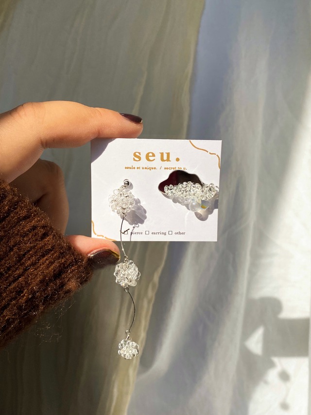 ぽつぽつ、きらり。 . 雪のような雨のような、そんな曖昧で美しい冬の天気をアクセサリーにしました。 キラキラの雨粒を透明なチェコビーズで表現し、クリアのビーズの奥に虹をイメージしたオーロラのビーズを閉じ込めました:) アシンメトリーのデザインになっており、ゆるりとした雲のミラープレートはseu.のオリジナルパーツになっております。 どこにもない、seu.だけの唯一無二のアクセサリーをあなたに。 軽い付け心地で、揺れるデザインをあまりつけたことがない方にもピッタリです。 シルバーですが、周りの色を取り込むような素材なのであまり強いイメージがなく優しい印象のある柔らかく、すっきりとしたアクセサリーで、どんなシーンにも使いやすくおすすめです。 material▶︎ミラーアクリル、チェコビーズ ーーーーーーーーーーーーーーーーーーーーーーーーーーーーー size list 縦 :約5cm 横 :約2.5cm 重さ:約6g(両耳) 金具:サージカルステンレス ※チタン、樹脂をご希望の方は備考欄に記載くださいませ。 ※イヤリングをご希望の方は、金具の形状を備考欄にご記載くださいませ。 (サージカルステンレスクリップ式、サージカルステンレスorチタン製 ねじ式) ※イヤリングの記載がない場合は、ねじ式イヤリングで発送させて頂きます。 ーーーーーーーーーーーーーーーーーーーーーーーーーーーーー カラー等、いつでもメッセージにご相談くださいませ:)