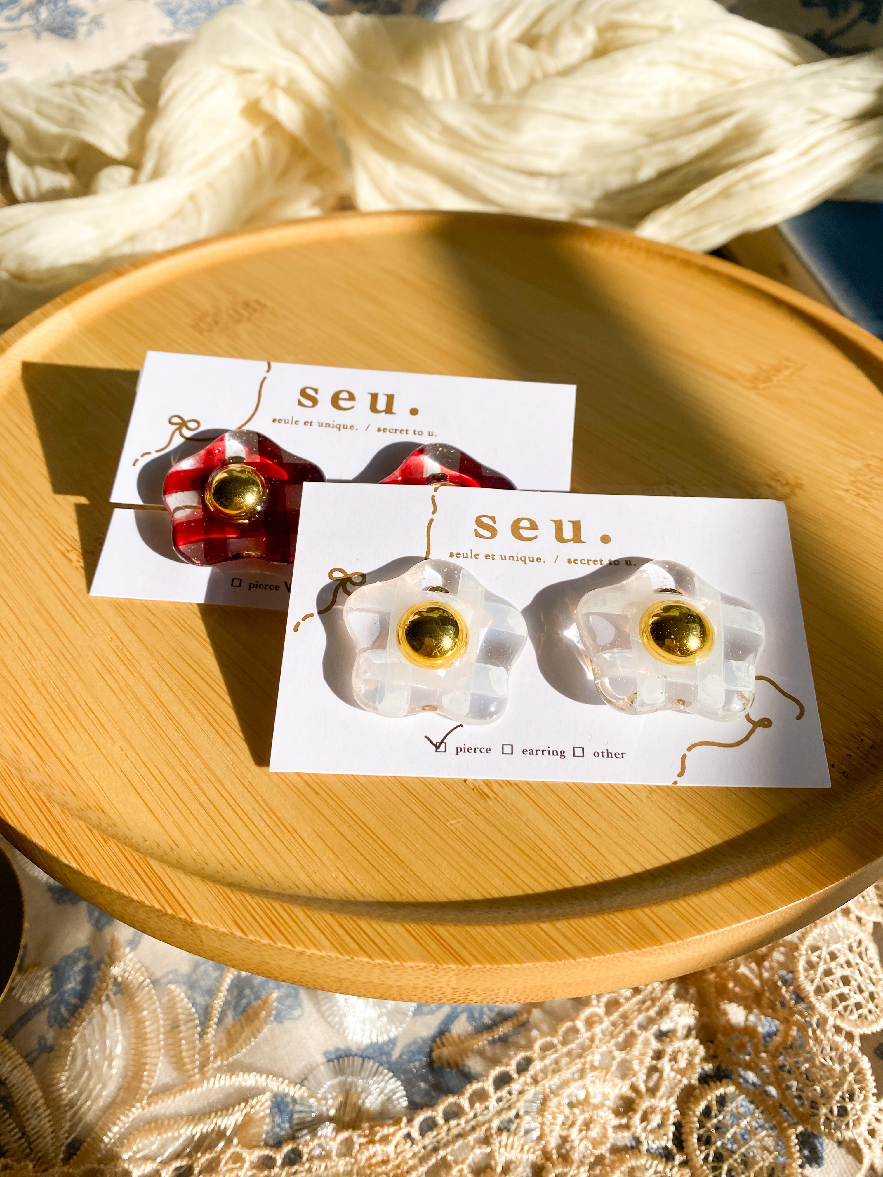 ちゅるんとした手触りに透け感のあるチェック柄が個性的なアクセサリーですが、