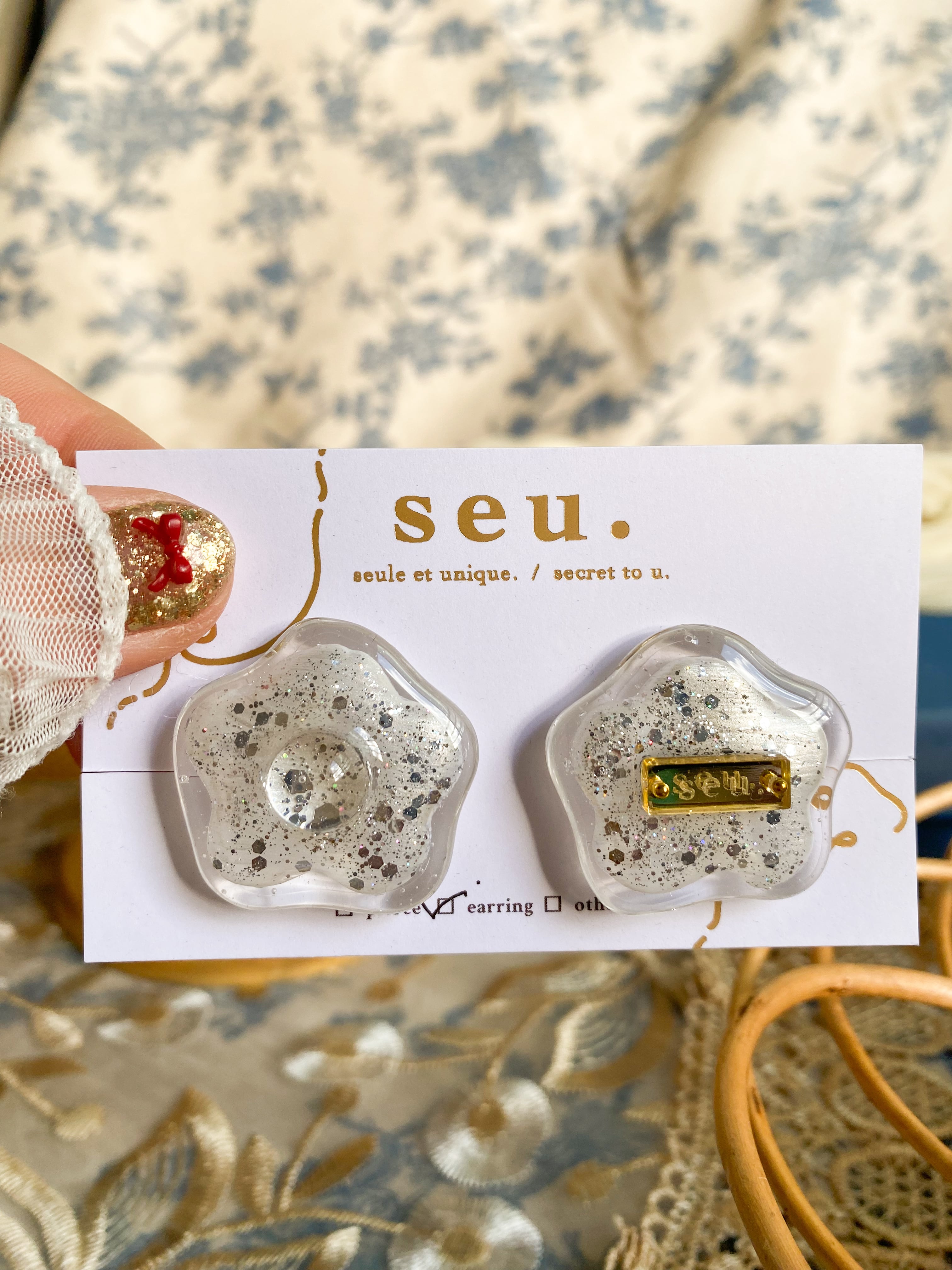 お花の種は一つ一つフリーハンドで作ったレジンパーツにアクリル絵の具で色付けしております。アクリル絵の具は原色を使わず、一色一色丁寧色を混ぜて、何層にも重ねているため奥行きがあり、キラキラとした仕上がりになっております。