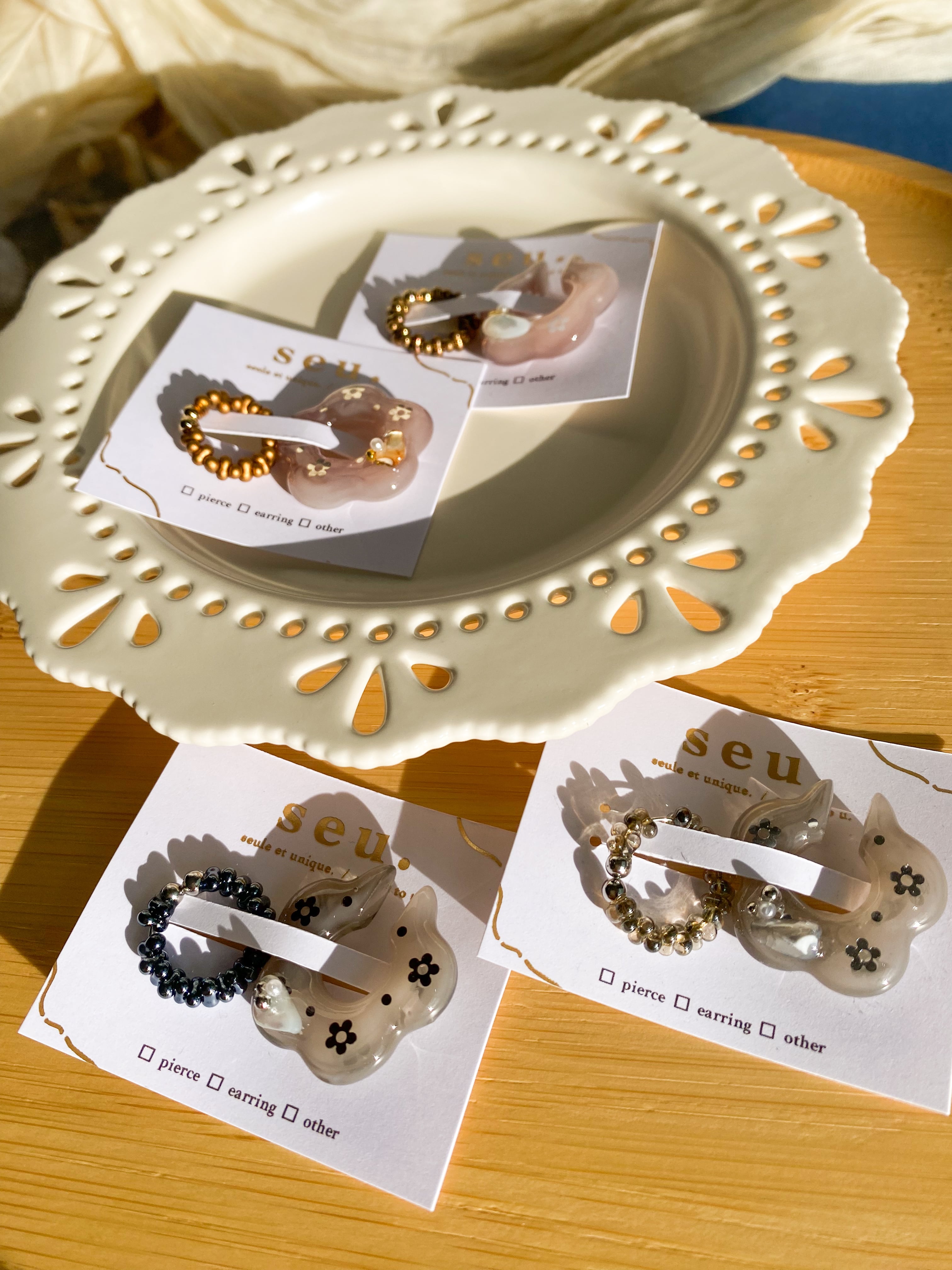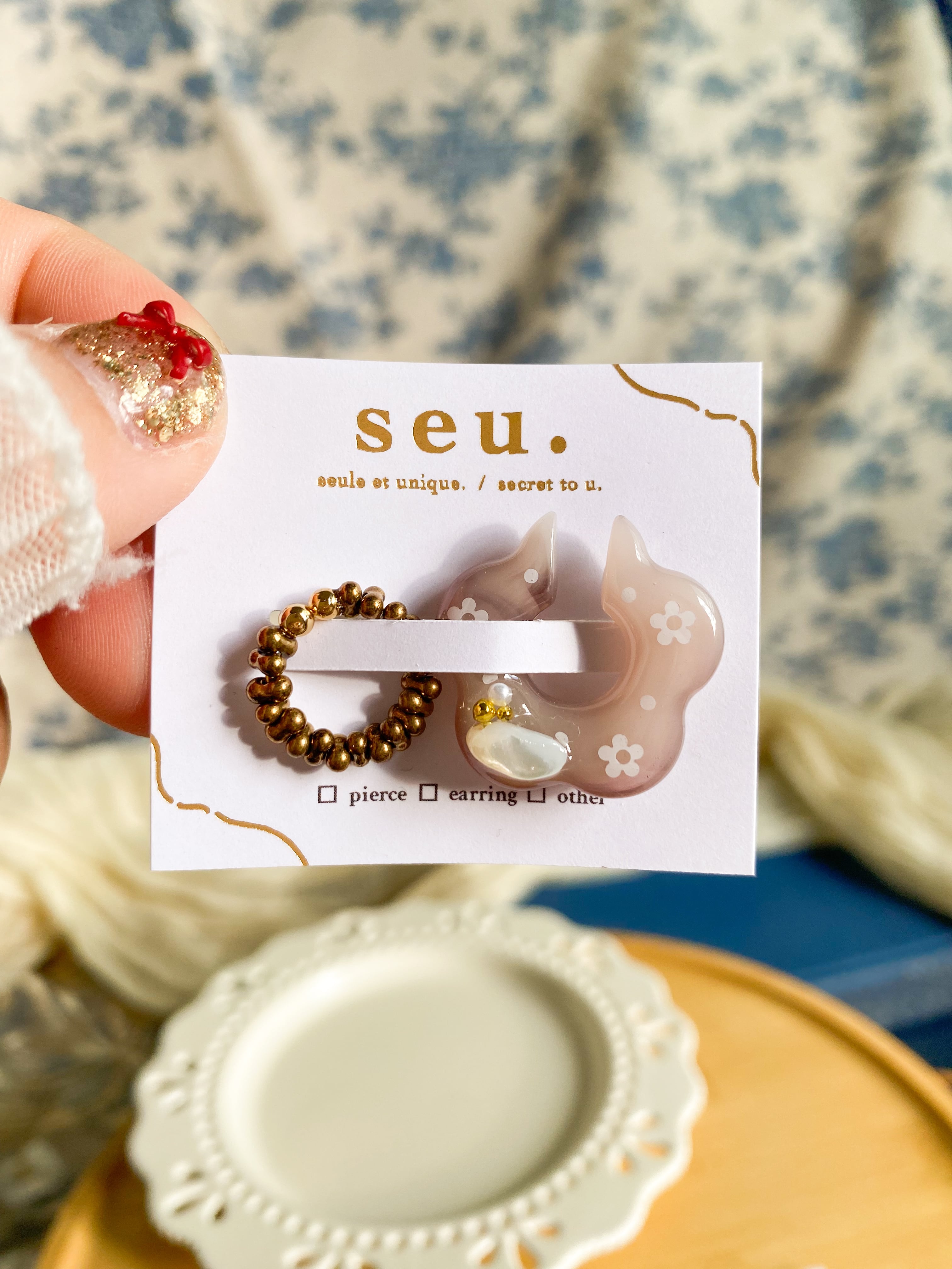 セットのイヤーカフも小粒なファルファーレビーズを繋げたシンプルなアクセサリーで合わせてお楽しみ頂けます。