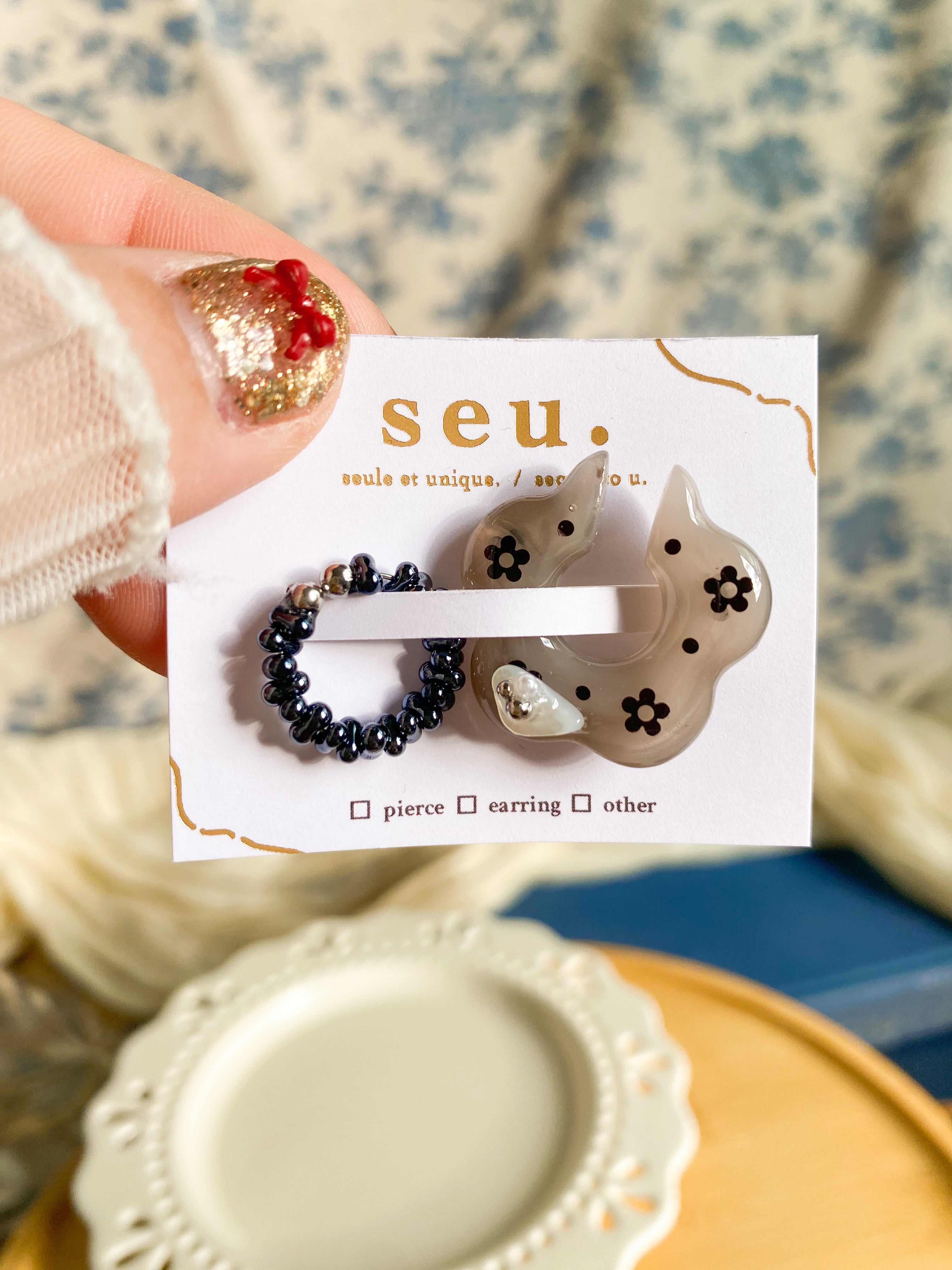 お花の形のイヤーカフにはドット柄にスパンコールが散りばめられており、シックなデザインの中に遊び心がある、日常使いしやすいアクセサリーです。