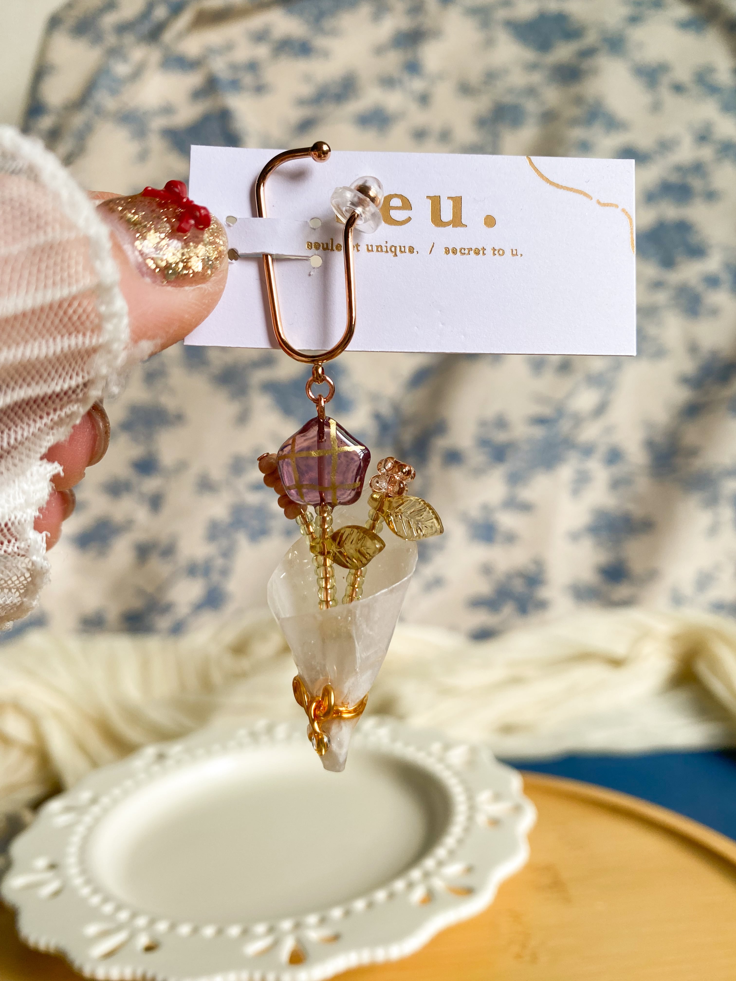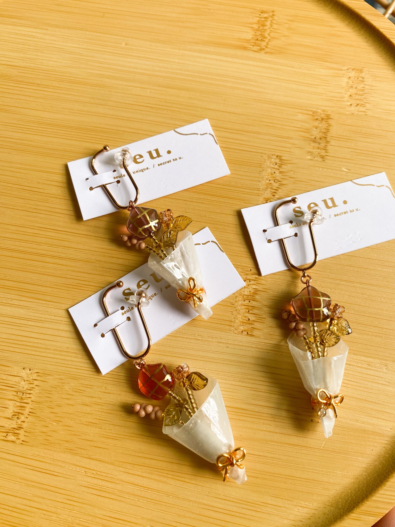 まるでお花屋さんで作ってもらったフラワーブーケのようなデザインのチャームをピンクゴールドのイヤーカフにあしらいました。