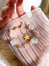 トップの部分には個性的なお花の形の淡水パールをあしらっており、全体的にぽわんぽわんとフリルのような形が壁に飾るガーランドに見えて愛らしいさもあり、普段綺麗めなアクセサリーを持っていない方にもおすすめのブレスレットになっております。